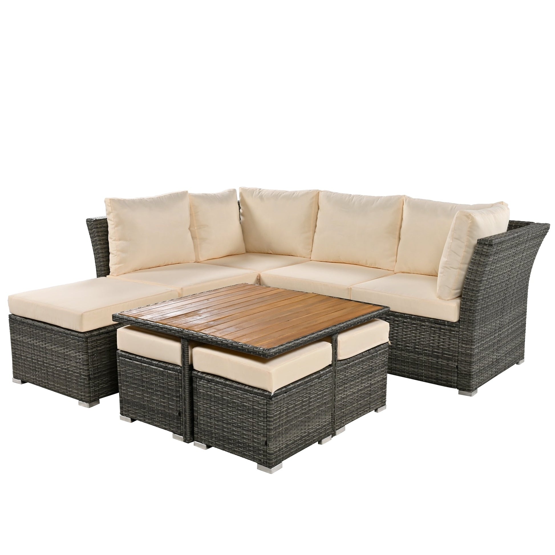 This set blends luxury with practical design. The sturdy frame ensures long-lasting durability, while the solid wood tabletop adds a touch of natural elegance to your outdoor area. Four ottomans tuck neatly beneath the table, providing extra seating or discreet storage to keep your space organized. Meanwhile, high-density foam cushions offer plush support, inviting you to lounge for hours without discomfort.