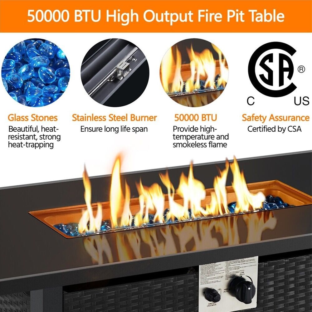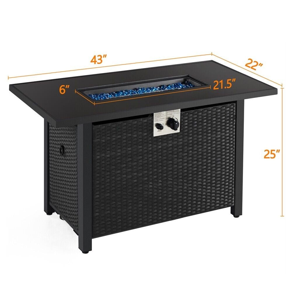 Transform your patio/backyard/porch into a delightful and cheerful place with this 43” fire pit table. This rectangular fire pit table is a perfect combination of versatile functions and modern style featuring a tempered glass tabletop and wicker side panels.