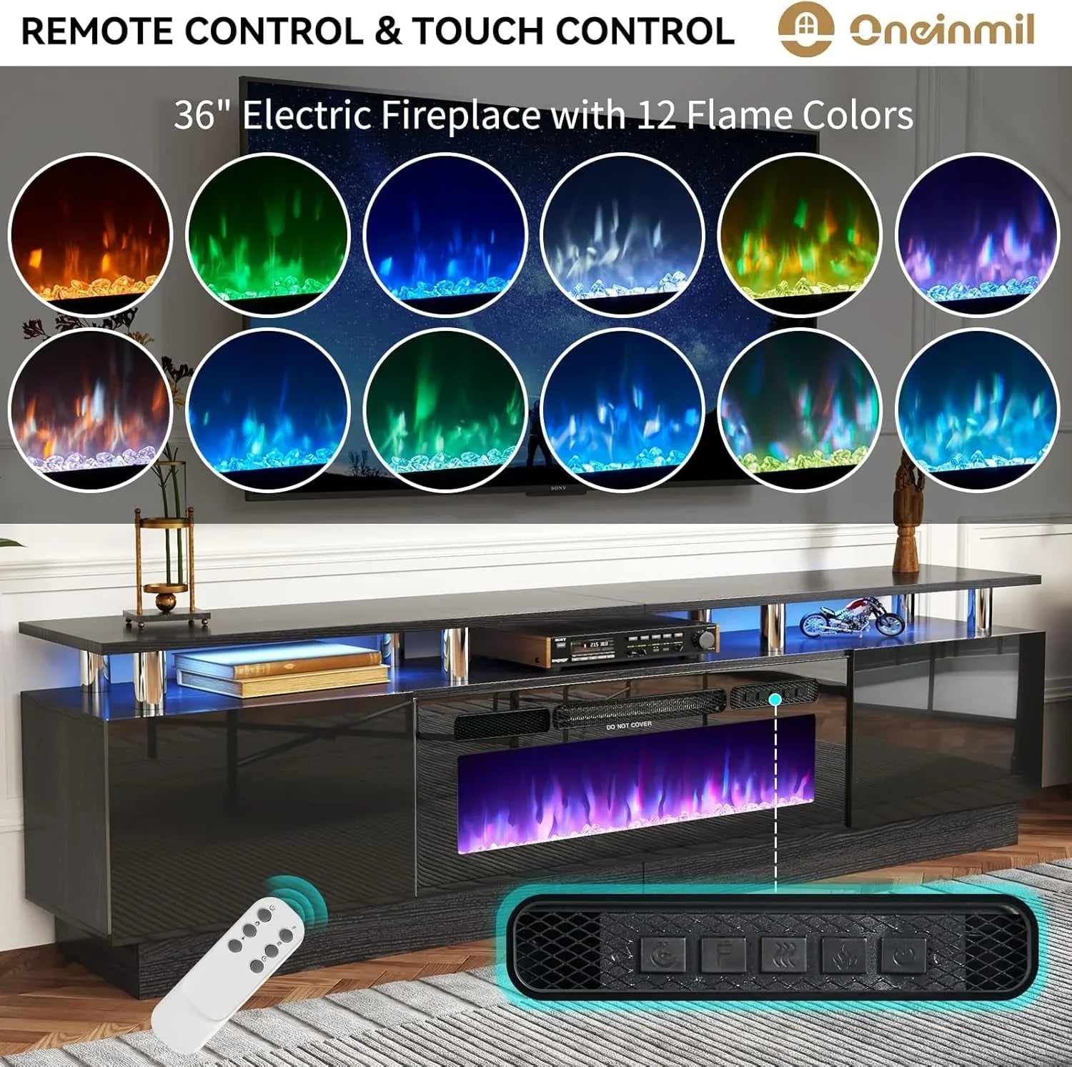 TV Stand with 36" Fireplace: 80"L stand integrates twelve colors electric fireplace with five dimmer levels & thirty-six colors LED... Read more