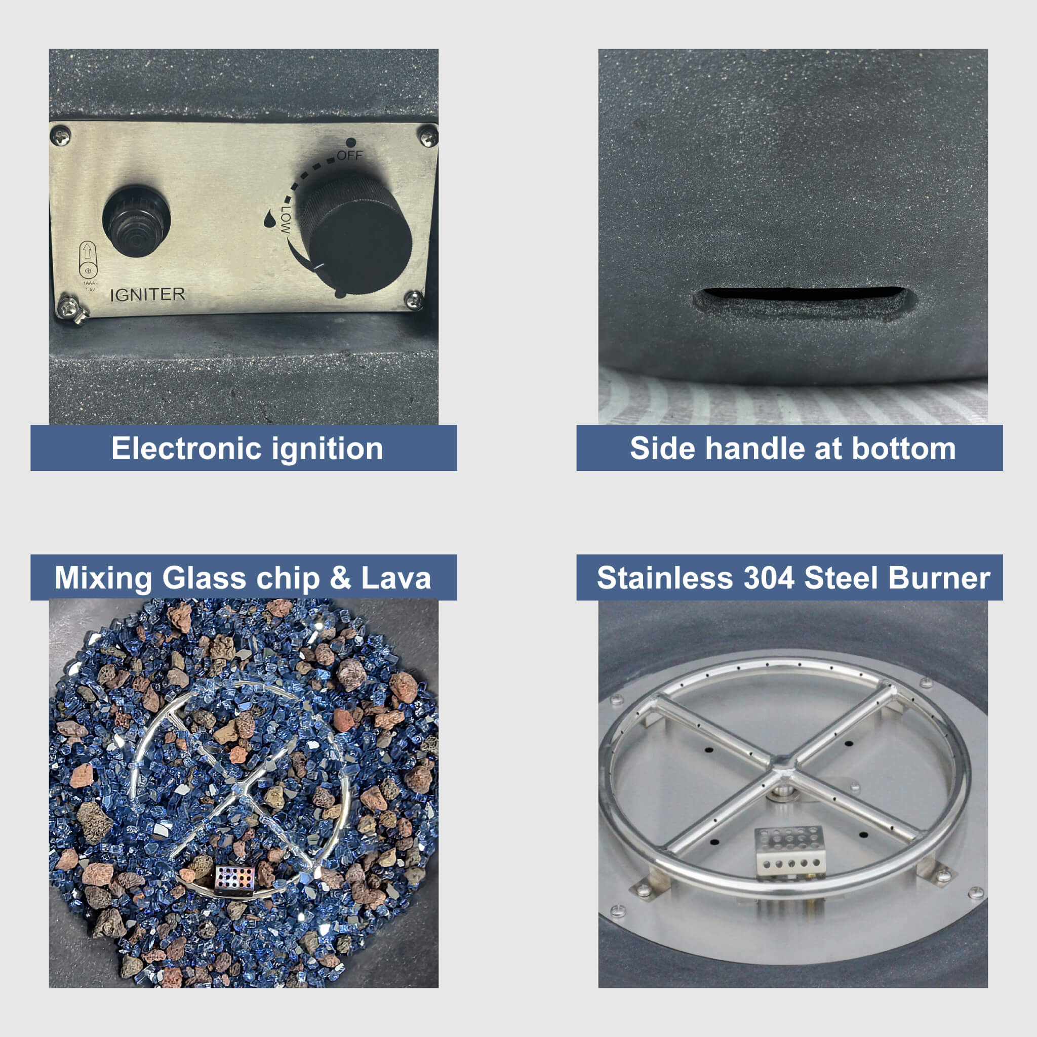 Creating the perfect ambiance is effortless. The CSA-certified propane burner provides up to 65,000 BTUs of clean, smoke-free heat, all at the push of a button with its simple pulse igniter. Everything you need is included right out of the box, from sparkling glass chips and natural lava stones to a protective fabric cover and adjustable feet for stable placement on any surface. It's the ultimate combination of art and functionality, designed to bring warmth and style to your life outdoors.