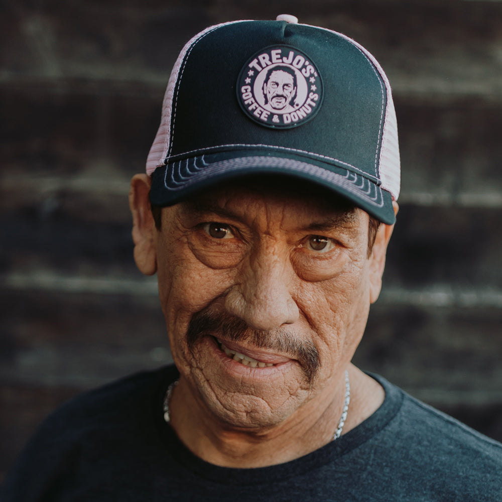 The Black/Pink Trucker Hat boasts the iconic Trejo's Coffee & Donuts logo in raised rubber detail. This versatile accessory is designed in a classic trucker hat style with a mesh back and adjustable snap-back closure, making it a comfortable and stylish choice for anyone.