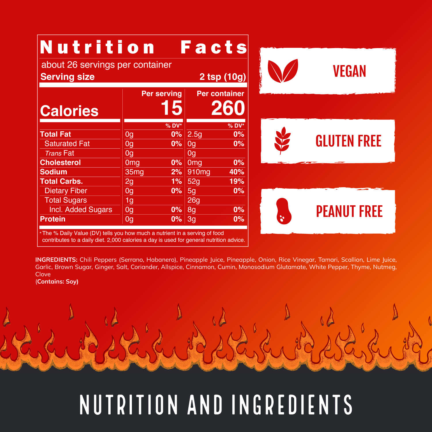 Buffalo Soldier brings together sweet grilled pineapple and aromatic baking spices like allspice, clove, and cinnamon to deliver a tropical Caribbean punch to any meal. This sauce packs authentic jerk flavor and heat with a fruity backbone for a robust and complex experience that unfolds on the palate. Enjoy this sauce on grilled meats or vegetables, with pulled pork, shrimp, or simply as a dipping sauce for a bit of sweet heat with every bite! 7/10 heat.