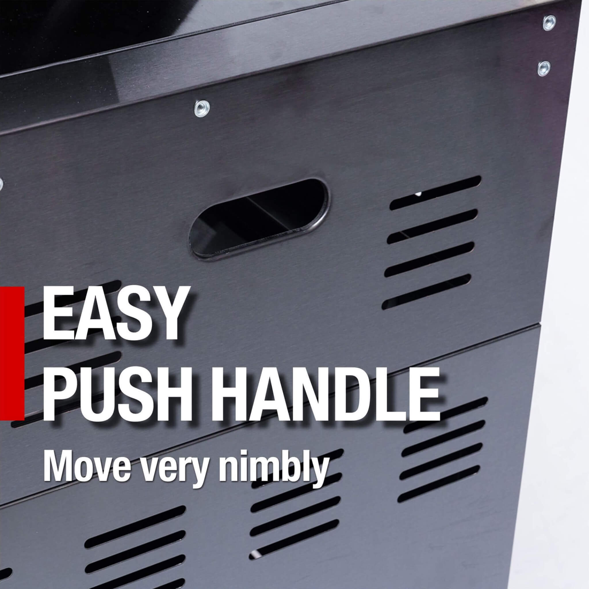 - Built with durable 304 marine-grade stainless steel for superior rust resistance, this outdoor kitchen features elegant black granite countertops and a double-lined hood with a built-in temperature gauge for maximum heat retention. For added convenience, it includes a full front pull-out grease tray, a bottle opener, and gliding castor wheels for easy mobility.