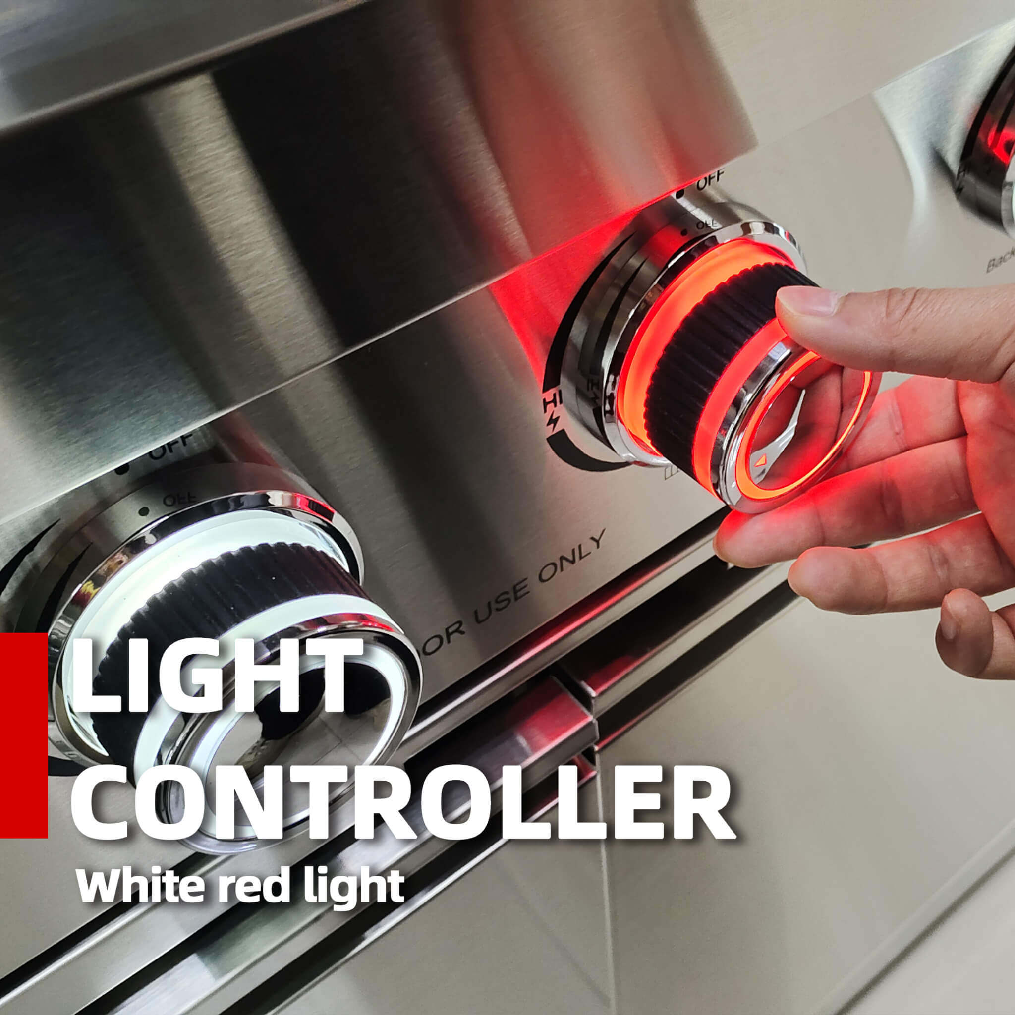 - Cook day or night with two internal halogen lights and stylish red-to-white LED-lit control knobs. A double-lined hood with a built-in temperature gauge ensures maximum heat retention for perfect results, while the elegant black granite countertops and a handy bottle opener add a touch of class to your outdoor space.
