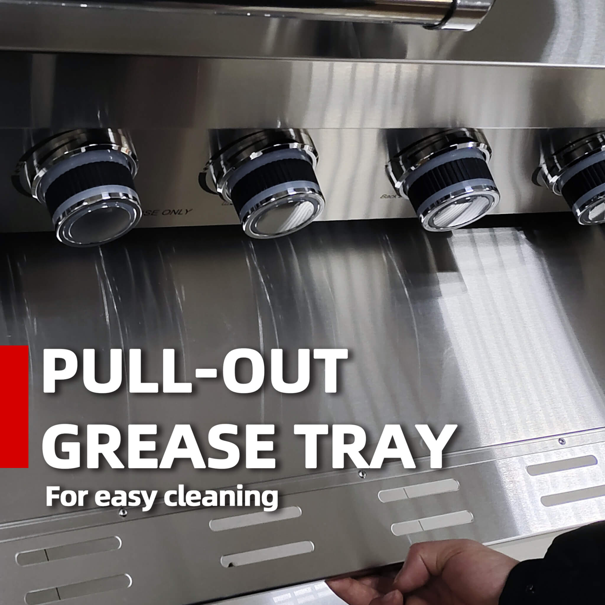 - This island arrives almost fully assembled with features designed for ease of use, including electronic ignition for quick startups and a full front pull-out grease tray for simple cleaning. Ample storage drawers and cabinets keep your tools organized, while gliding caster wheels allow you to effortlessly move and secure your kitchen island anywhere you please.