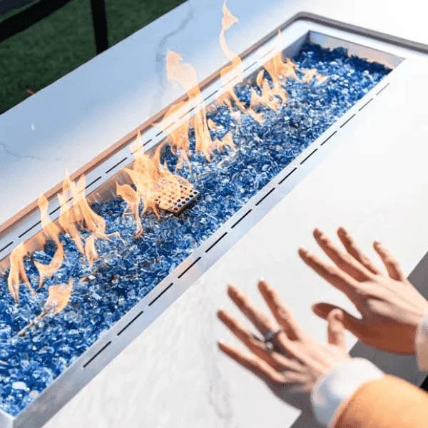Nobody wants to be running around buying accessories after already having paid for the main attraction. And with the Elementi Plus Carrara, you don’t have to. The fire table comes with its porcelain lid, a canvas cover, and just the right amount of Blue Fire Glass needed to fill the fire pit of the table right out of the box. And if that’s not enough, it also comes with a two-year warranty. You can also buy a matching gas tank cover for the propane model and a windshield for the fire pit separately if those are what you’re looking for. So what are you waiting for? Order now for the lowest rates and the quickest shipping, straight to your doorstep.