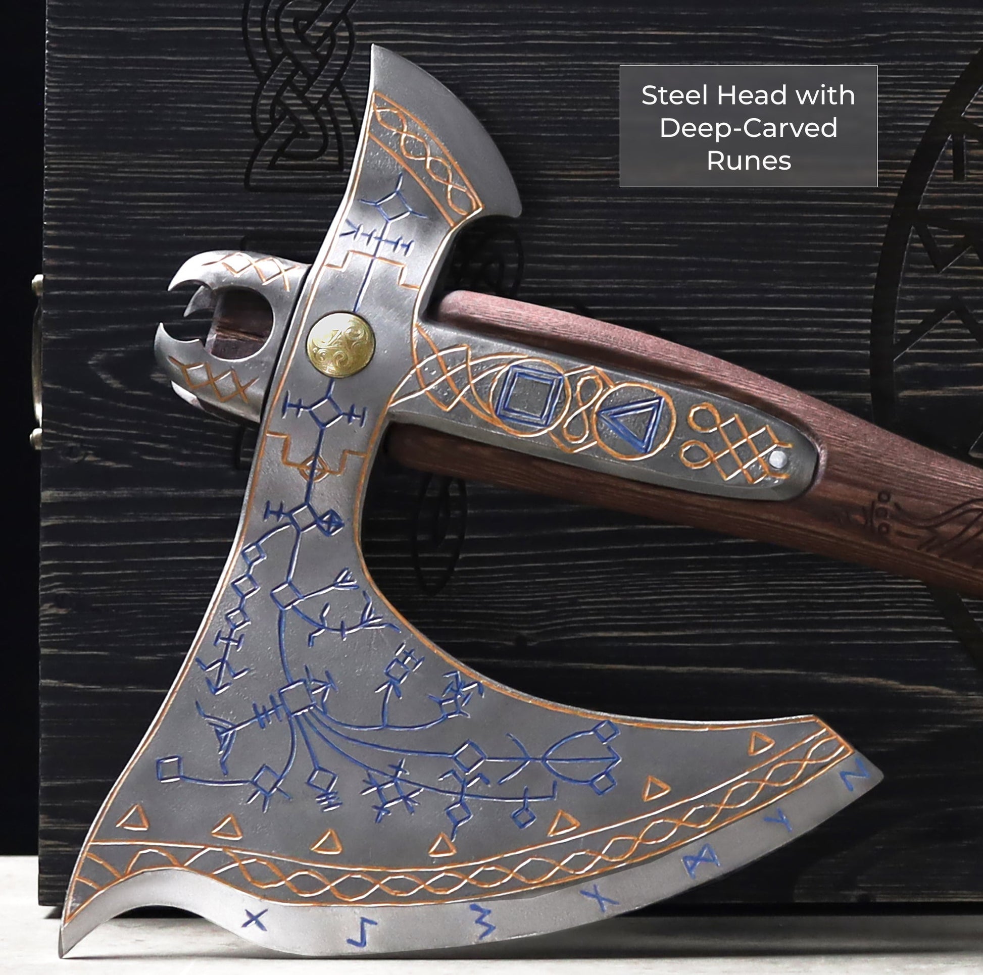 - Aesthetic & Authentic: this axe features intricate carvings on its ashwood handle. The inclusion of a mysterious dwarf rune further enhances its mythical appeal and storytelling depth.