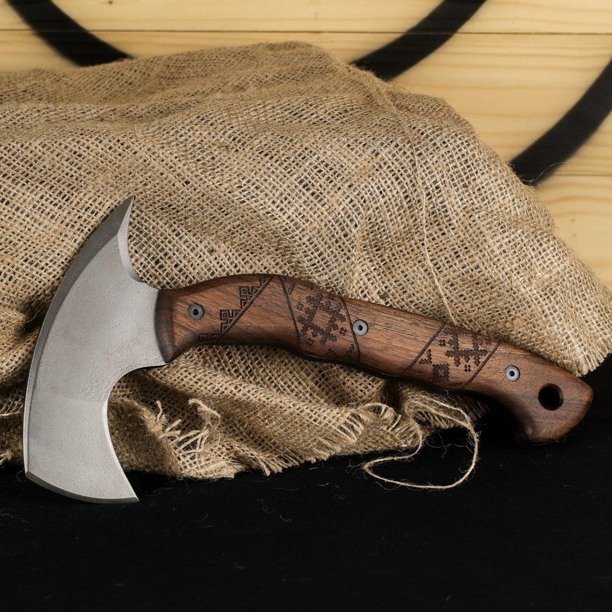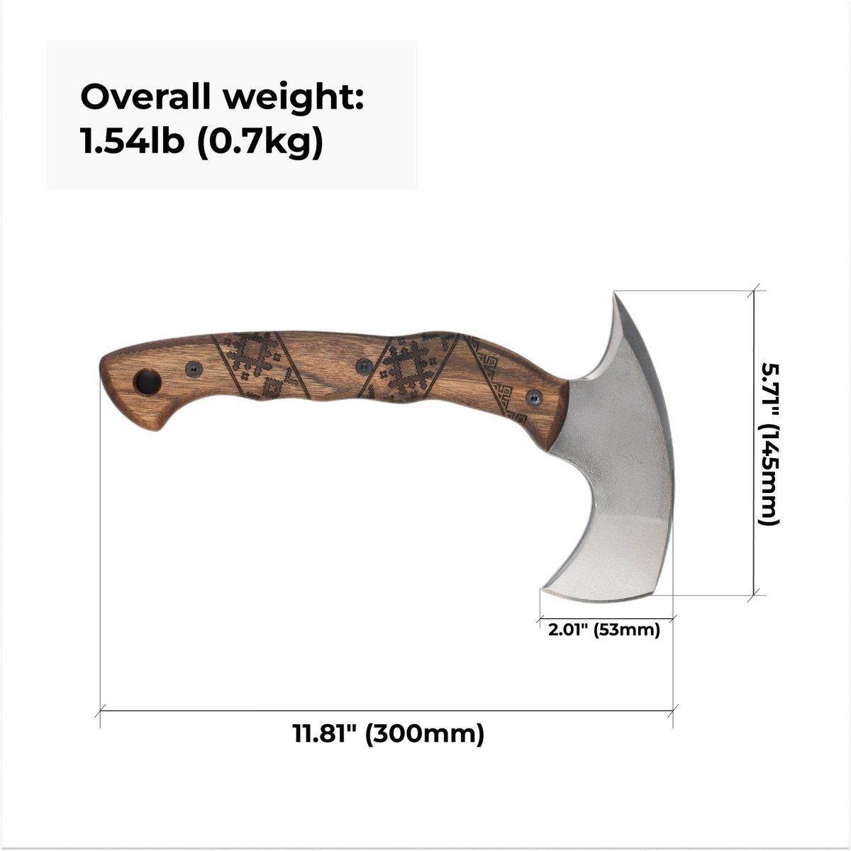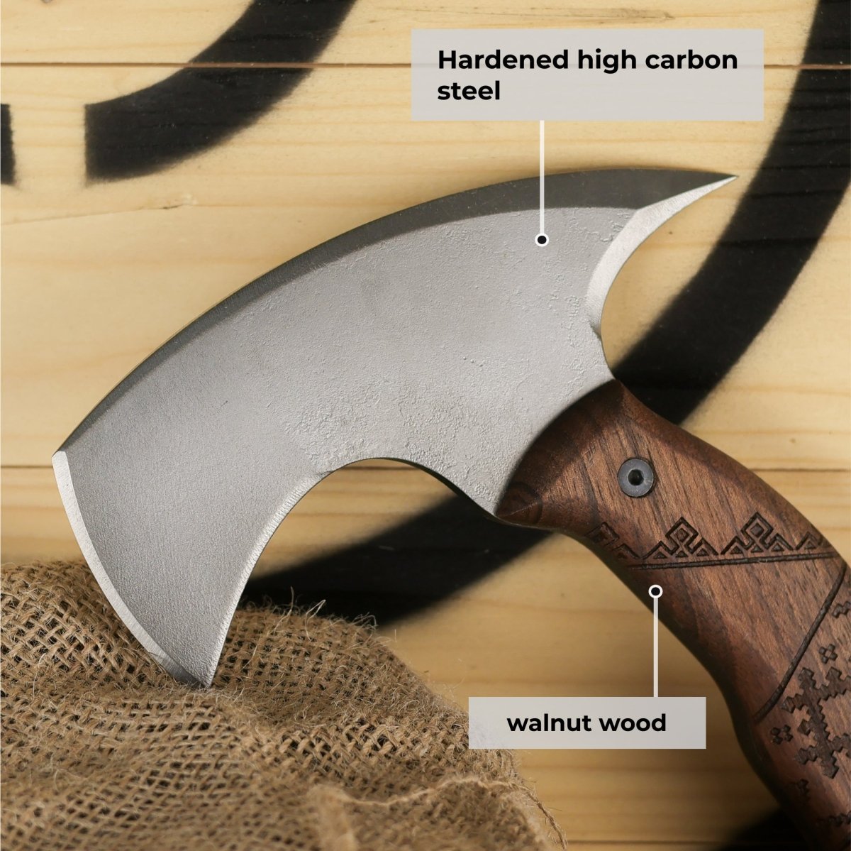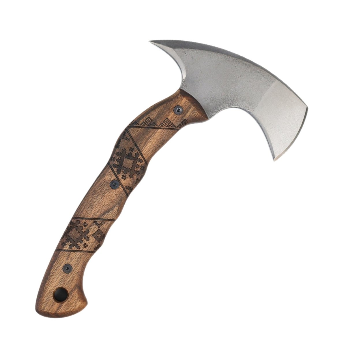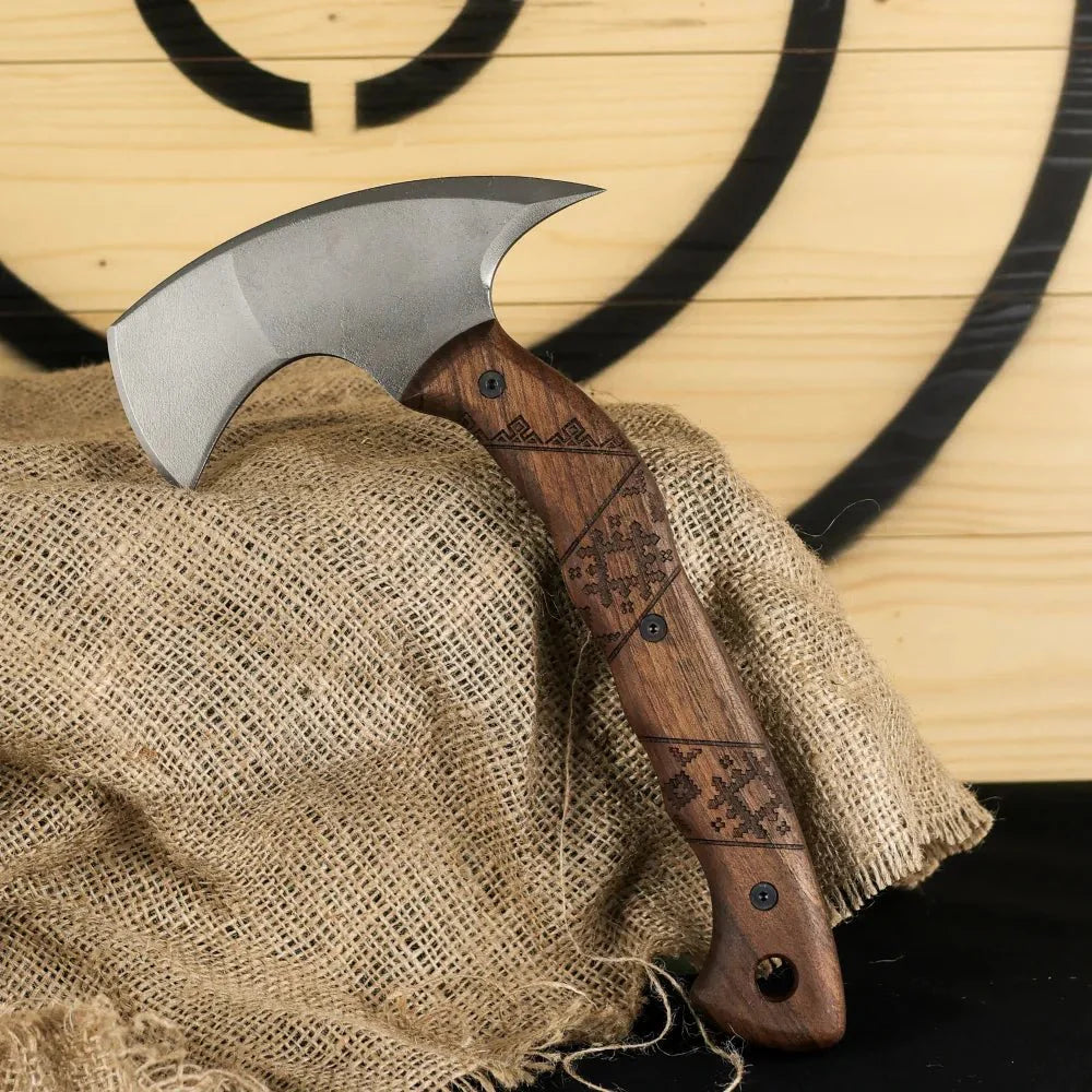 - Superior Craftsmanship: The handle of "Simargl" is carved from durable walnut, known for its strength and comfort. Its high-carbon steel head is expertly forged, ensuring long-lasting sharpness and precision. Every axe is meticulously handcrafted to handle the toughest challenges in any environment.