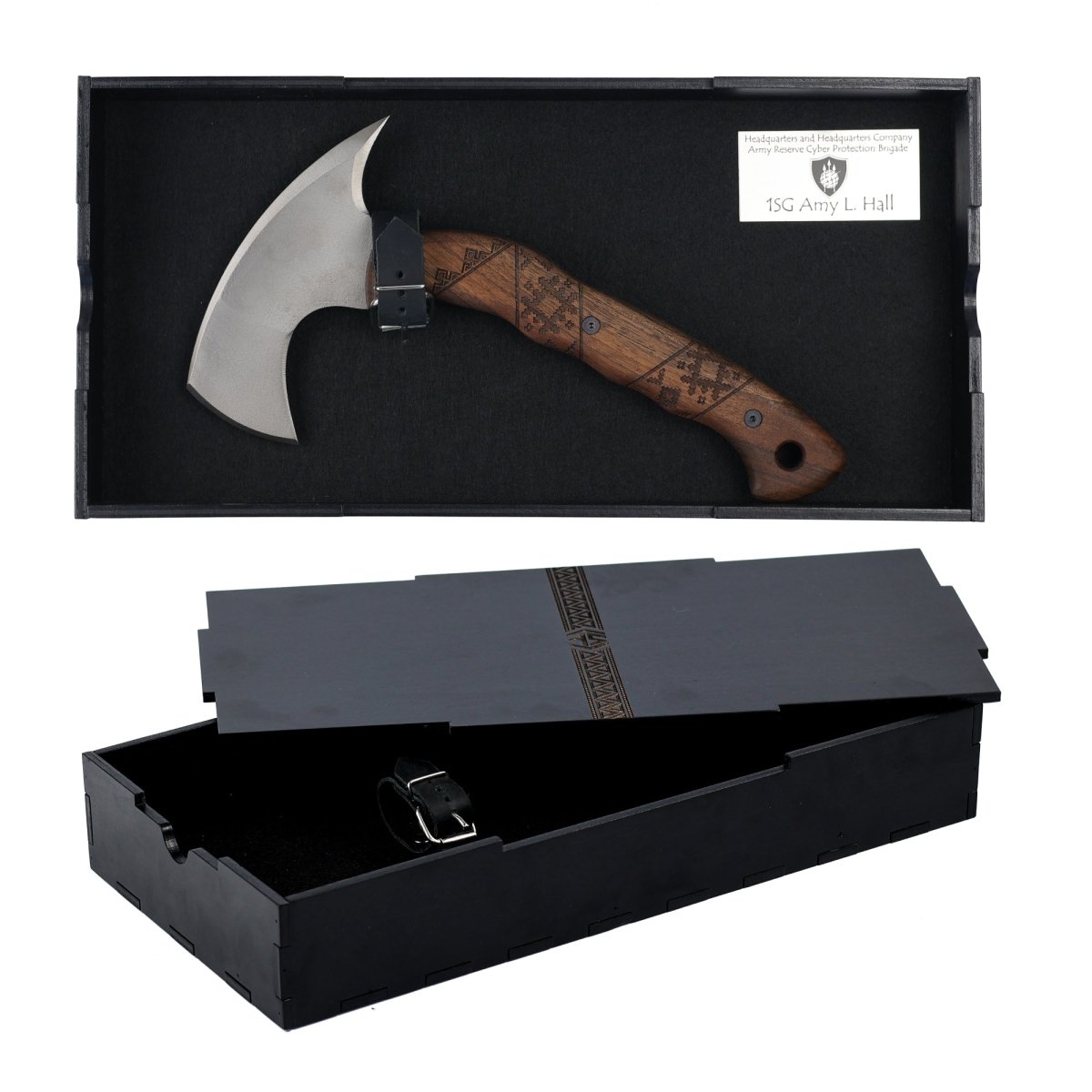 If you purchase an axe with box and the engraving option, by default, we engrave the axe. If the engraving is too large, we will place it on the box. If you have a specific preference for the engraving location, please contact us here: support@ancientsmithy.com