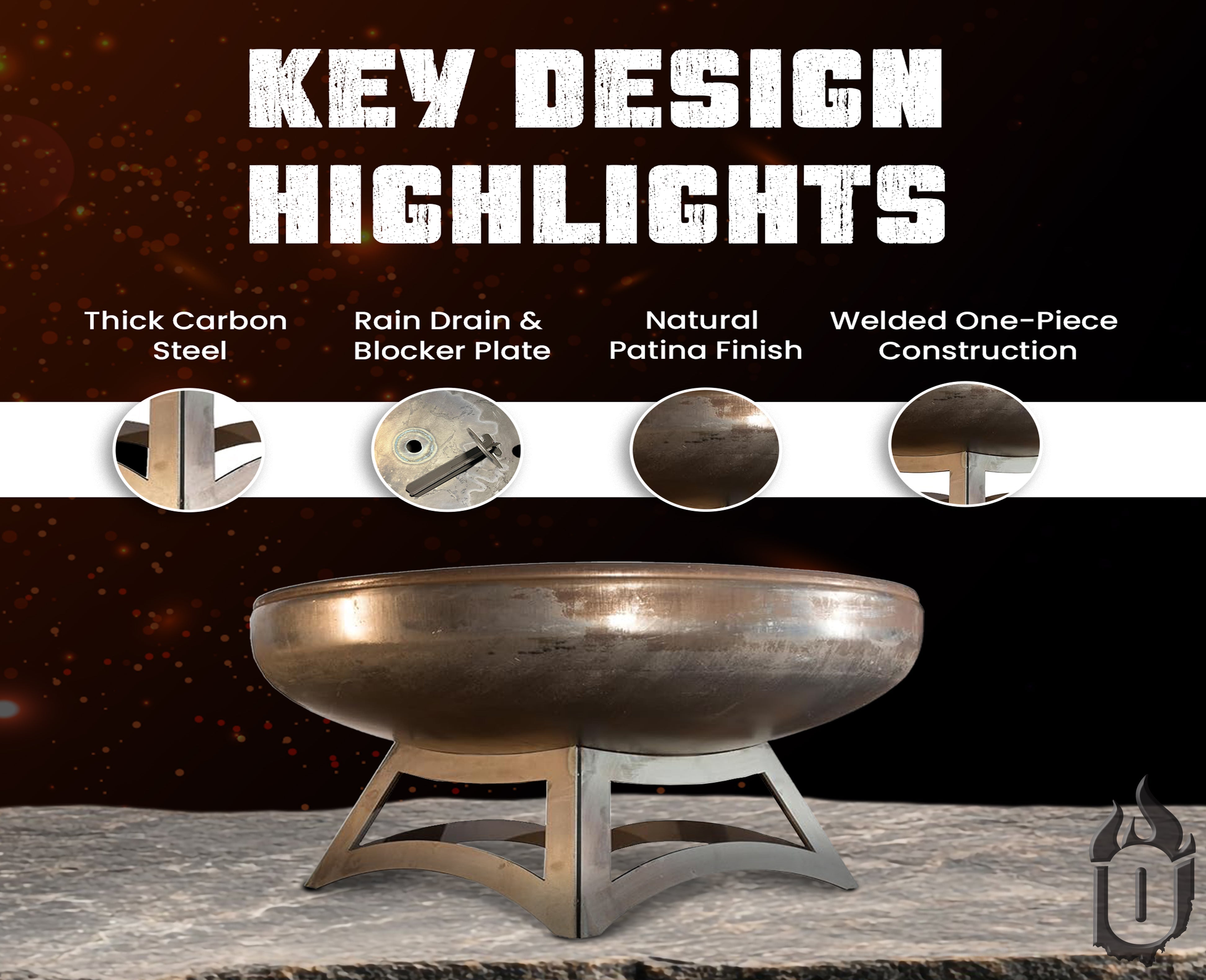 24" Diameter - 14.5" Height - 7.5" Bowl Depth (Weighs 50 lbs.), 3/16" thick steel