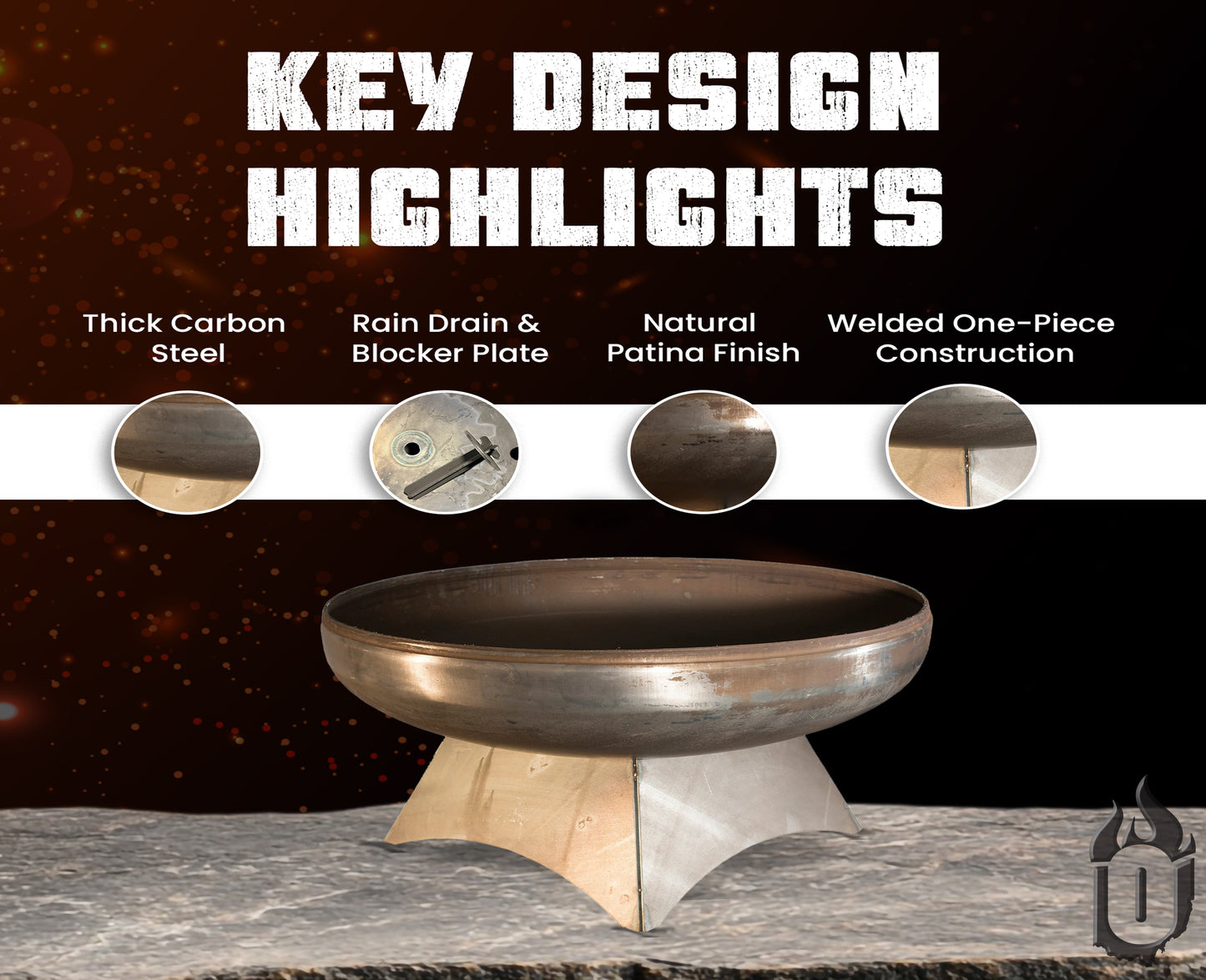 24" Diameter - 14.5" Height - 7.5" Bowl Depth (Weighs 50 lbs.), 3/16" thick steel