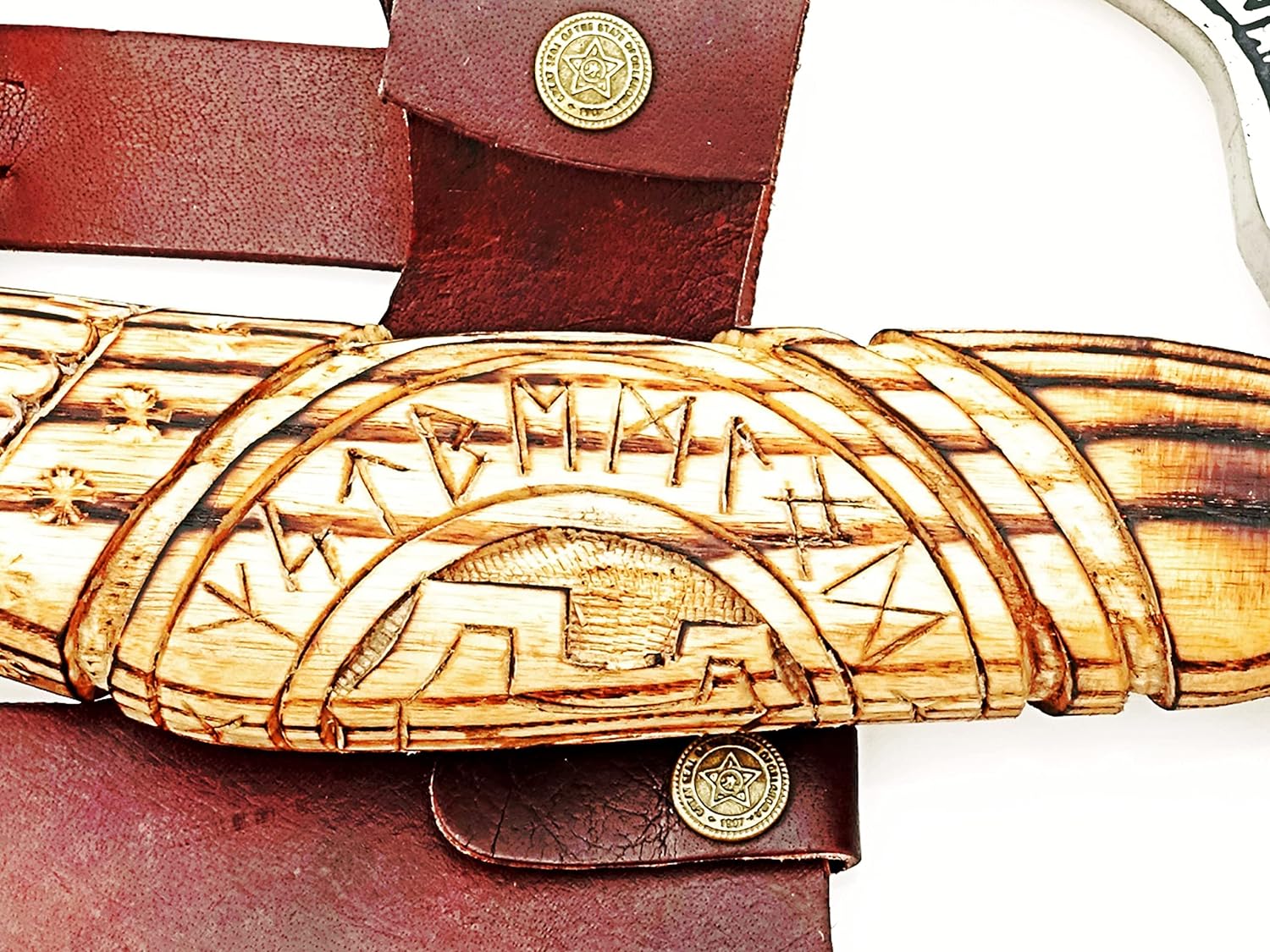 The Norse Axe - Odin’s Edge is a masterfully crafted tool, perfect for everyday tasks or as a statement piece in any collection. Its forged 1095 steel blade features intricate designs achieved using the etching metal method, providing both durability and visual appeal. The hand-engraved ash wood handle and wraped, ensures a comfortable and secure grip during use. With a sharp edge and a Rockwell Hardness of 55-60 HRC, this full-working axe is as functional as it is beautiful. Complete with a leather sheath for protection, this axe is ideal for chopping, camping, and outdoor use.