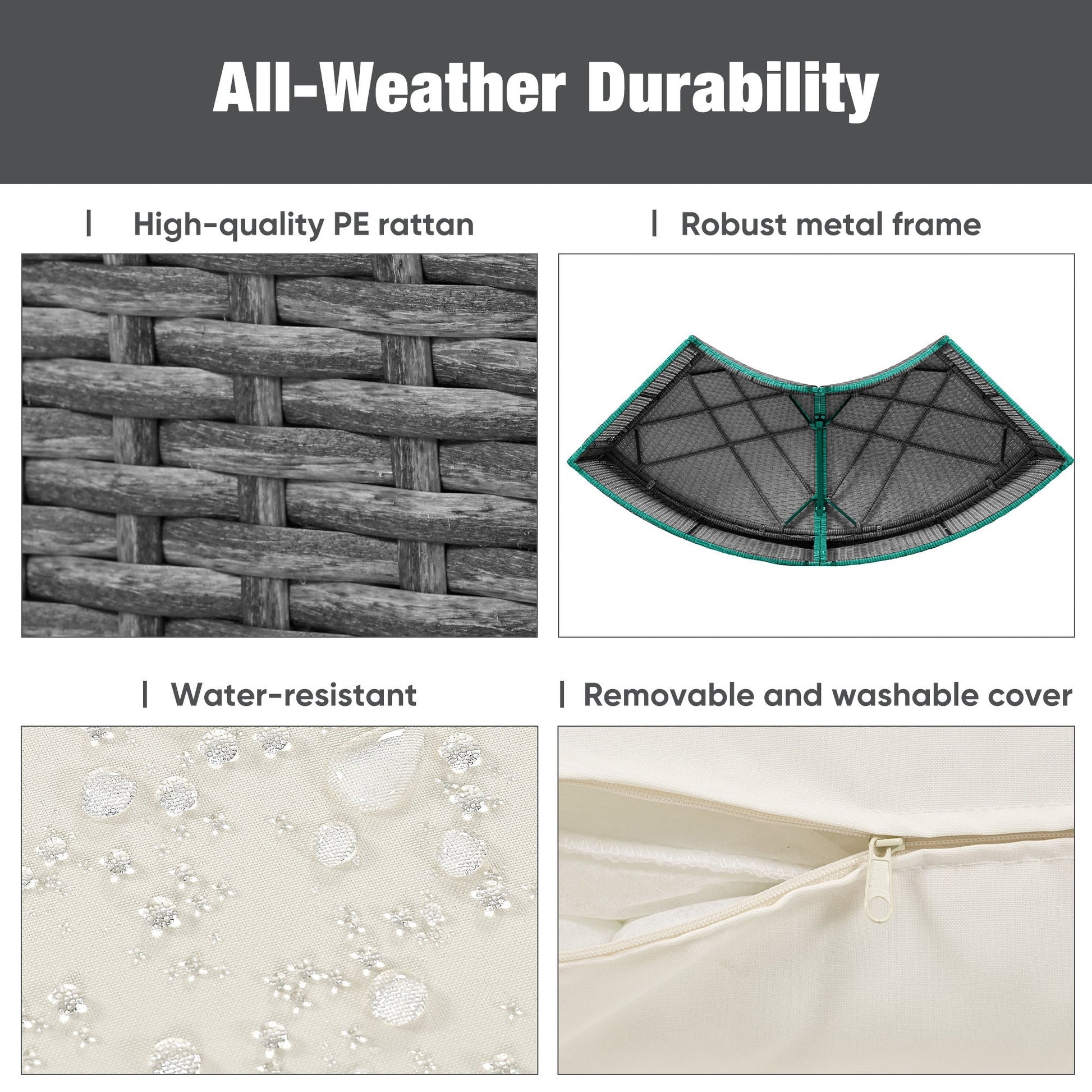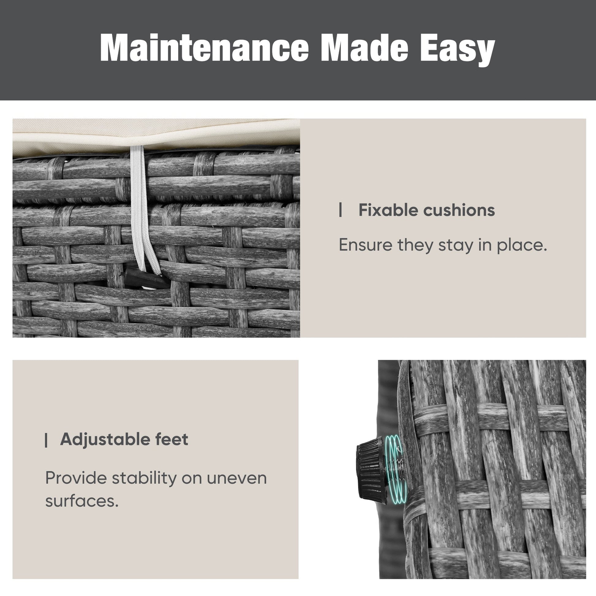 Constructed from premium materials, this set features high-quality PE rattan known for its weather resistance and easy maintenance. Plush foam cushions, covered in washable fabric, offer exceptional comfort and keep the furniture looking fresh season after season.
