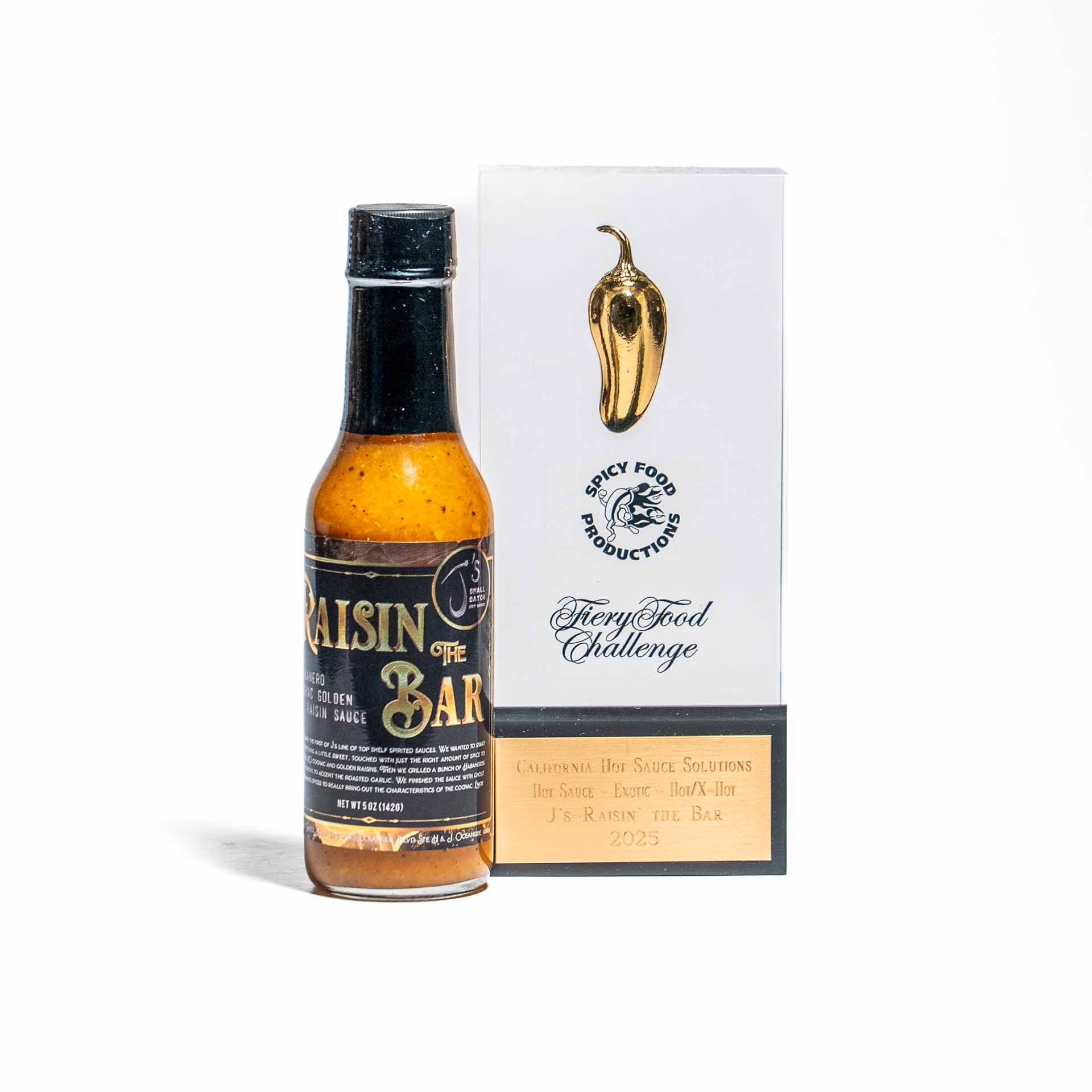 Raisin The Bar is the first of J's Line of top shelf spirited sauces. We wanted to start off with something a little sweet, touched with just the right amount of spice to accompany an XO cognac and golden raisins. Then we grilled a bunch of Habaneros and Vidalia onions to accent the roasted garlic. We finished the sauce with Ghost pepper and baking spices to really bring out the characteristics of the cognac. Enjoy